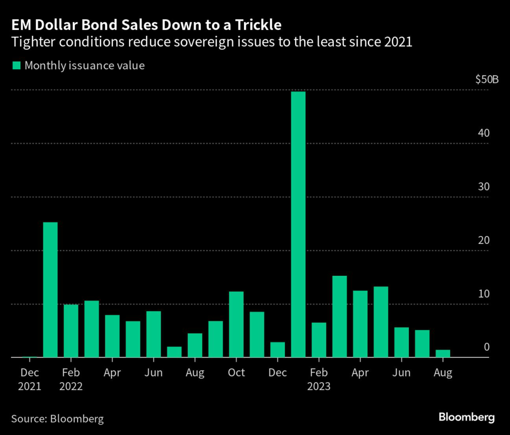 Only $1.4 billion has been raised in emerging debt this month, compared with $4.5 billion in August 2022 and average monthly sales of $15.4 billion this year.