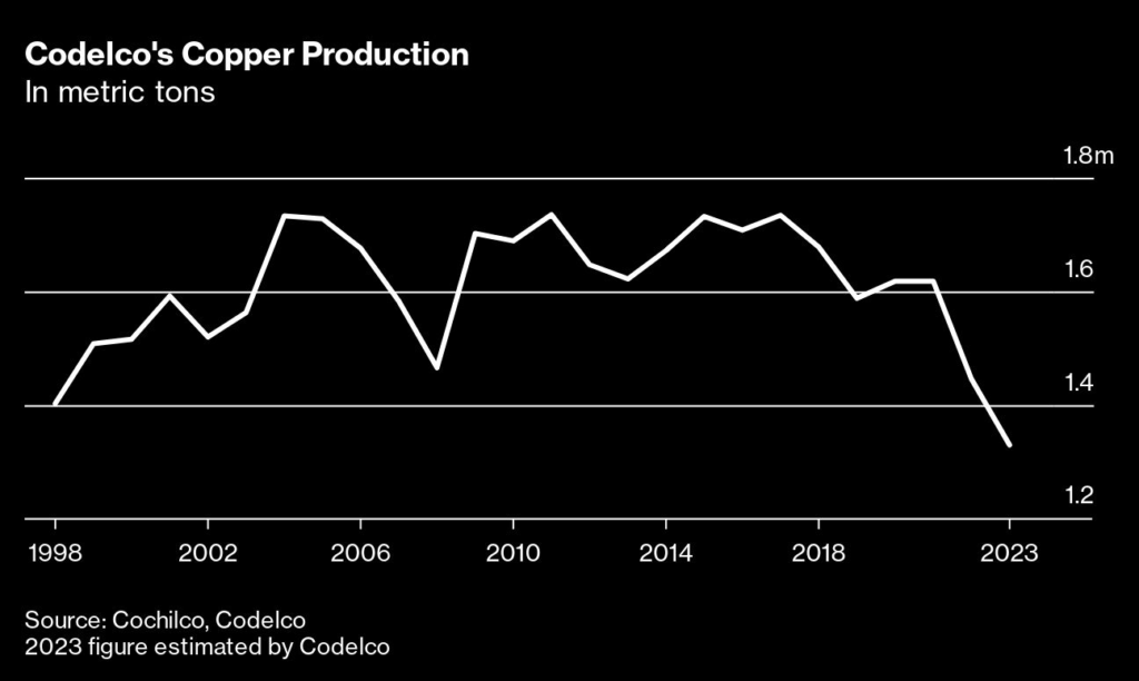 Codelco is facing the possibility of a credit rating cut as slumping production, rising costs and project disruptions dim leverage metrics at the world’s biggest copper supplier.