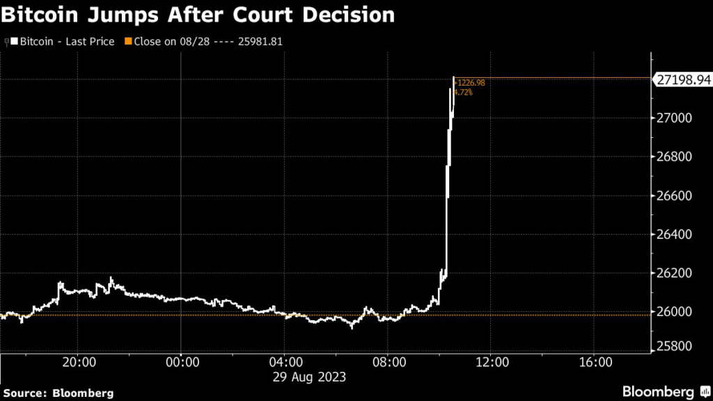 The rally happened after the crypto asset-manager scored a legal victory in federal court in its bid launch the first Bitcoin ETF in the US, a key development for the digital-assets industry.