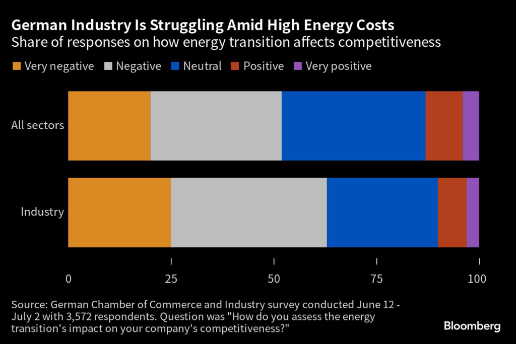 Over half of surveyed companies say the energy transition is having negative or very negative effects on their competitiveness, according to a report by the German Chamber of Commerce and Industry.