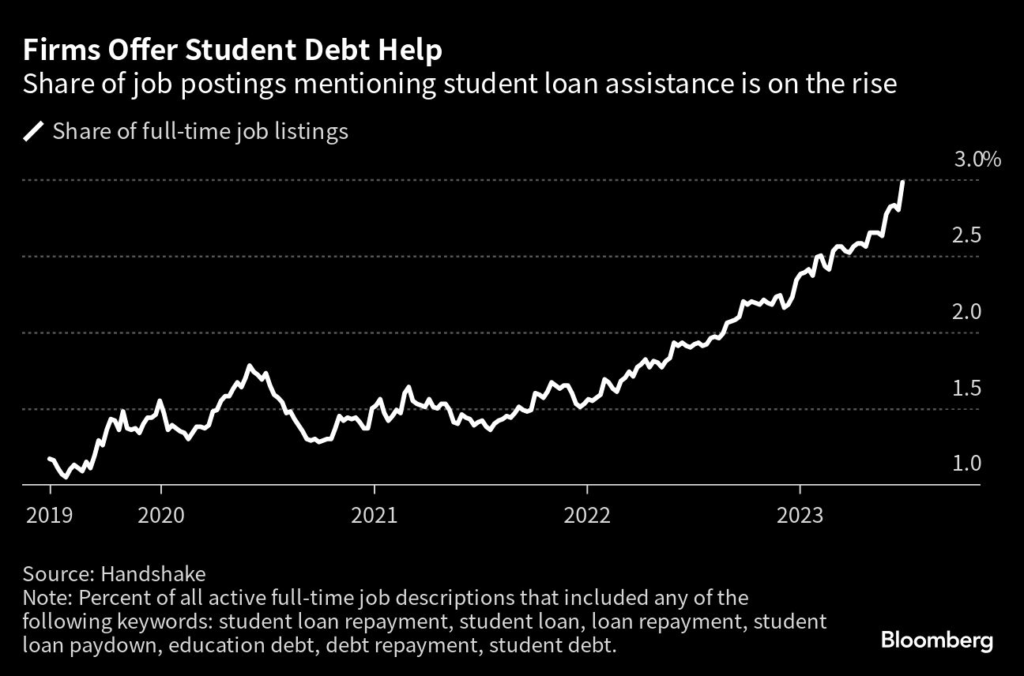 (Bloomberg) — The share of employers offering student loan repayment benefits is climbing as companies hope to gain a competitive advantage in recruiting younger workers in a still-tight labor market.