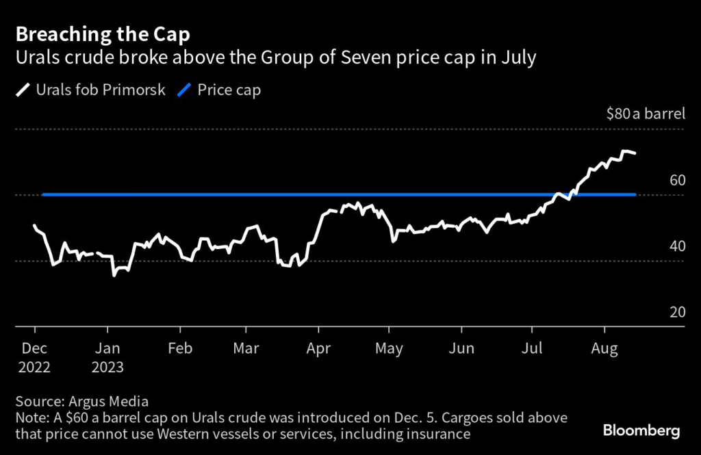Prices for Russia’s Urals crude rose above the $60 a barrel cap imposed by Group of Seven countries, above which cargoes cannot be carried on Western vessels or use services such as financing or insurance provided by Western firms.
