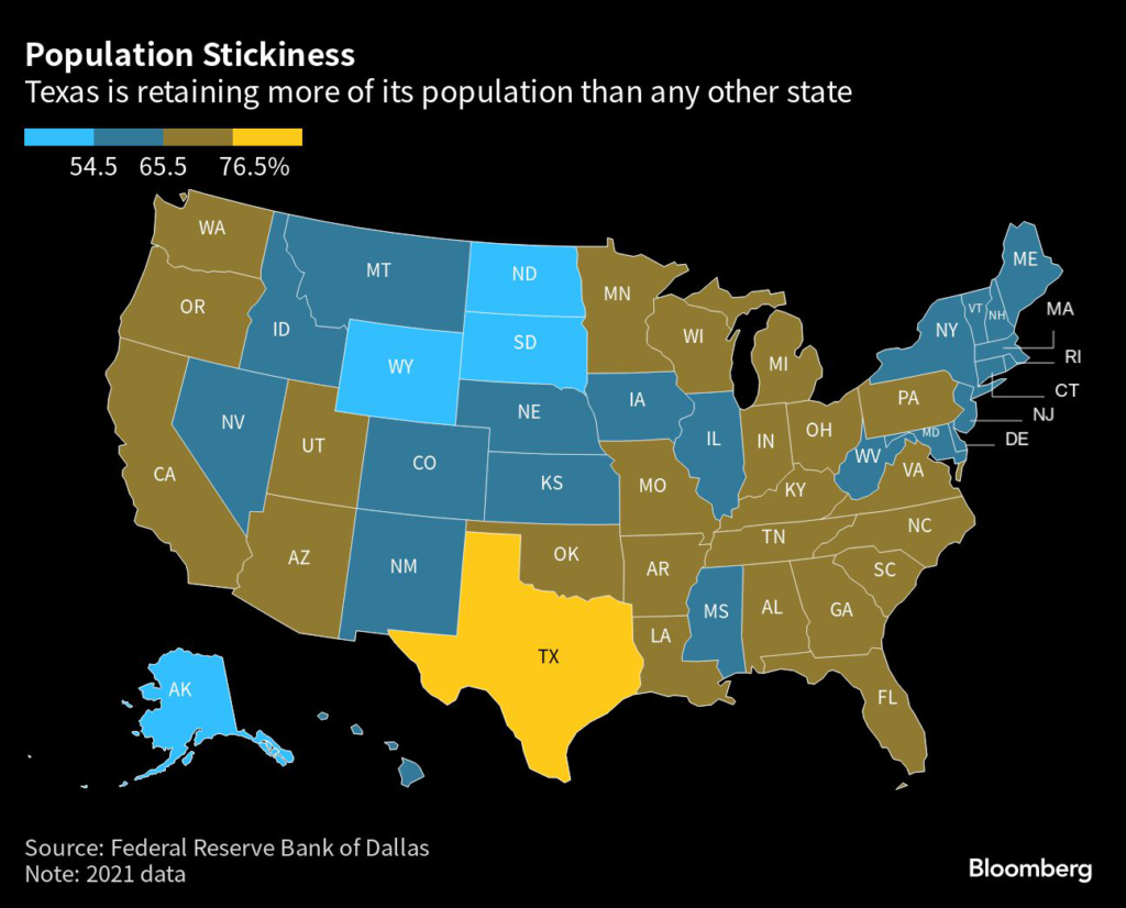 (Bloomberg) — Many Americans take pride in their home state — but Texans are more likely than anyone else to settle down there.