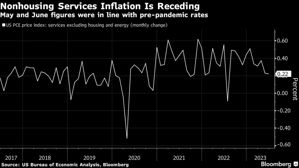 Data for May and June showing 0.2% increases in nonhousing services prices — similar to pre-pandemic rates — followed a two-year period in which they were rising at about double the pace.