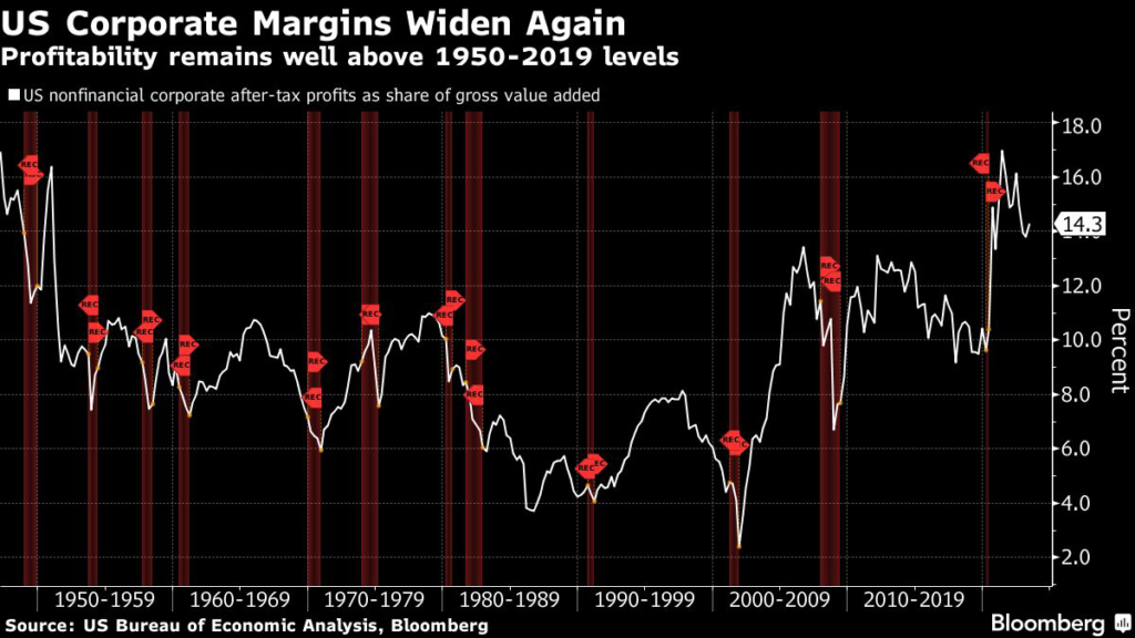 Measured as a share of gross value added — a proxy for aggregate profit margins — they rose to 14.3% from 13.8%.