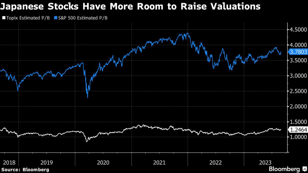 The average price-to-book ratio of companies in Japan’s benchmark Topix index is still just 1.25, versus around 3.78 for the S&P 500, providing scope to invest in companies with low ratios and agitate for change.