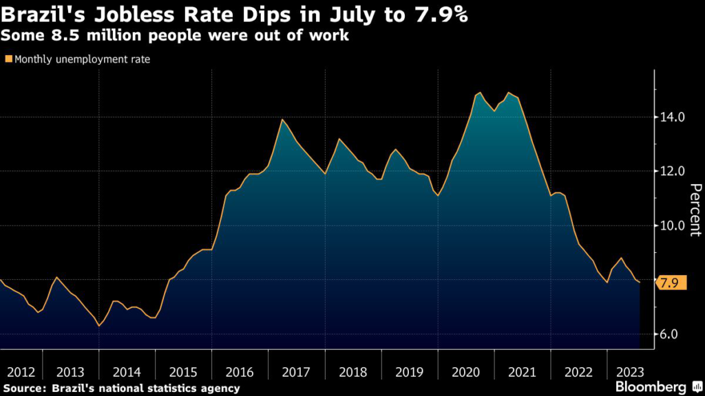 Brazil’s unemployment rate ticked down for a fourth straight month in July, underscoring the resilience of Latin America’s biggest economy in the face of headwinds including double-digit borrowing costs.