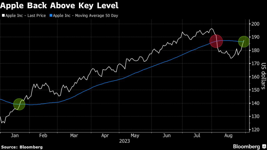 Apple gained 1.9% on Wednesday, a rally that took the iPhone maker back above its 50-day moving average, a positive sign for short-term momentum trends.