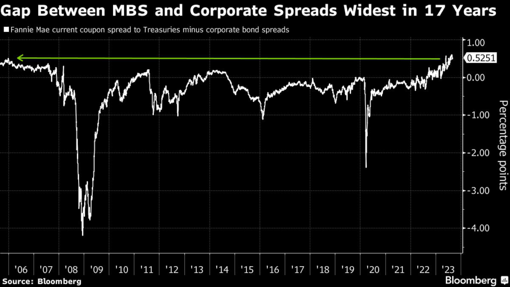 New mortgage bonds now offer yields that are about 1.66 percentage point higher than US Treasuries, according to data compiled by Bloomberg. That’s the most relative to corporate bonds in 17 years.