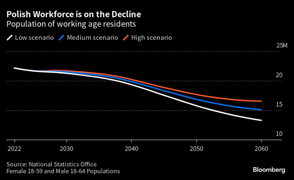 Such a drop would pile more pressure on Poland’s labor-hungry $688 billion economy and strain public finances as the number of retirees surges.