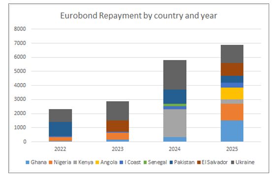 Developing nations with a riskier credit profile that have debt coming due next year include Ukraine, Ivory Coast, Kenya, Egypt and Pakistan.