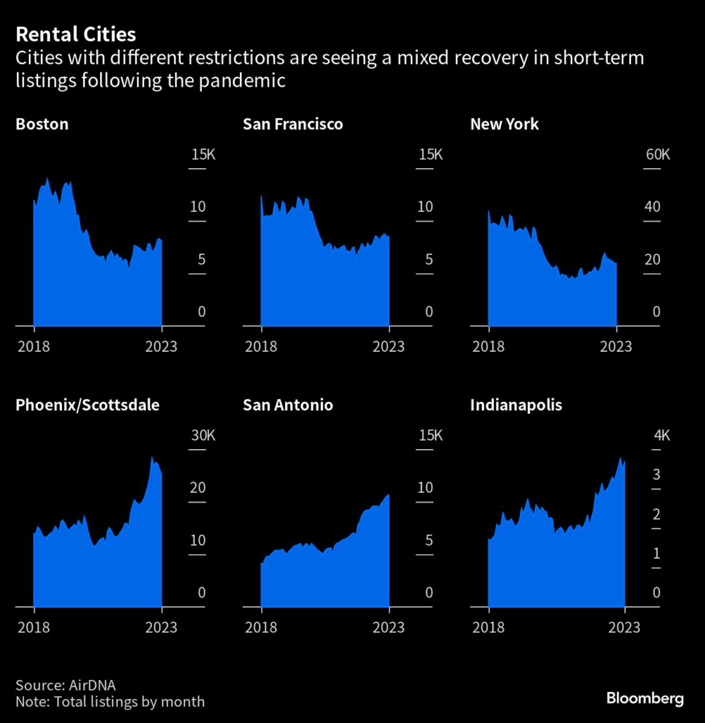 While demand has been recovering, some cities that imposed tighter rules still remain below where they were before Covid, according to researcher AirDNA, which tracks data from Airbnb and Vrbo.
