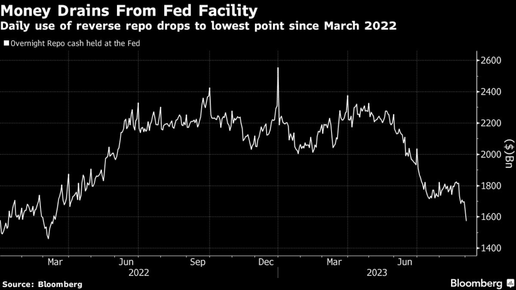 (Bloomberg) — A Federal Reserve facility that briefly topped $2.5 trillion at the start of the year is approaching $1.5 trillion in size as the institutional investors that use it are increasingly convinced the central bank is done raising interest rates.