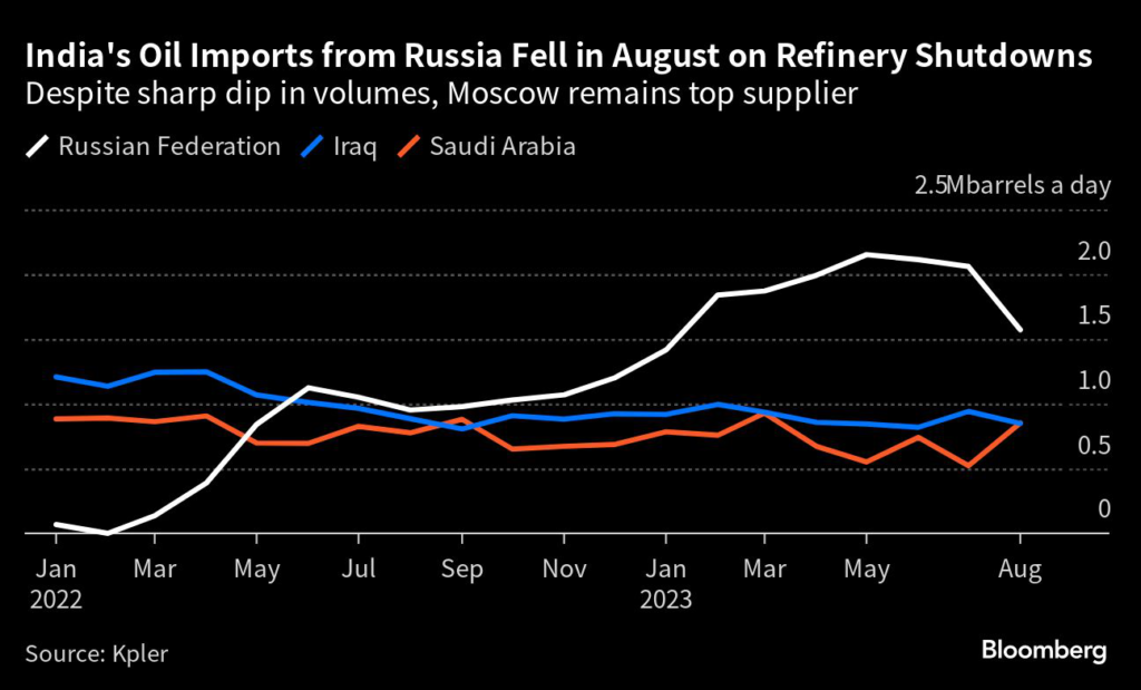 In August, imports from Russia fell for the third consecutive month to 1.57 million barrels a day, according to data-intelligence firm Kpler, down 24% on the month and at the lowest since January — though Russia remains India’s top supplier.