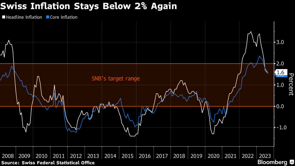 The headline inflation gauge has now been below the 2% ceiling targeted by the Swiss National Bank for three months.