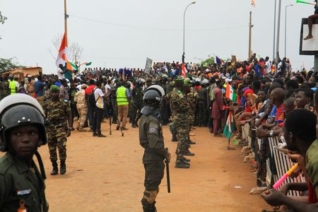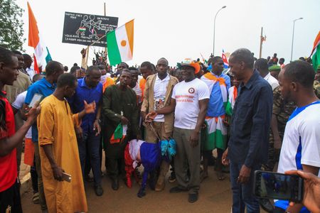 NIAMEY (Reuters) – Tens of thousands of protesters gathered outside a French military base in Niger’s capital Niamey on Saturday demanding that its troops leave in the wake of a military coup that has widespread popular support but which Paris refuses to recognise.