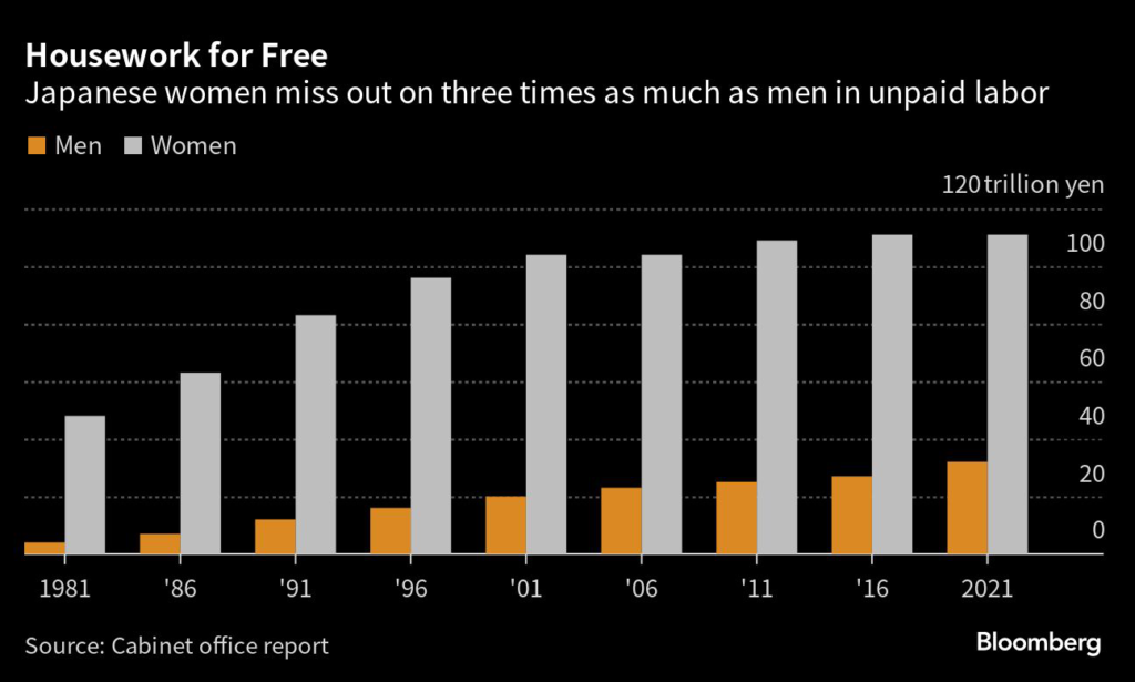 While men also engage in ¥32 trillion of unpaid labor around the home, that’s less than a third of what women do, according to a Cabinet Office report.