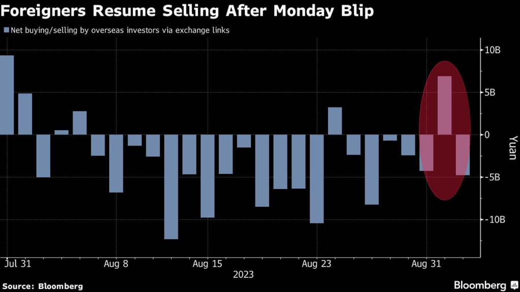 Foreign funds sold about 90 billion yuan ($12 billion) of mainland shares in August via the trading links with Hong Kong, the most in data compiled by Bloomberg going back to 2016.