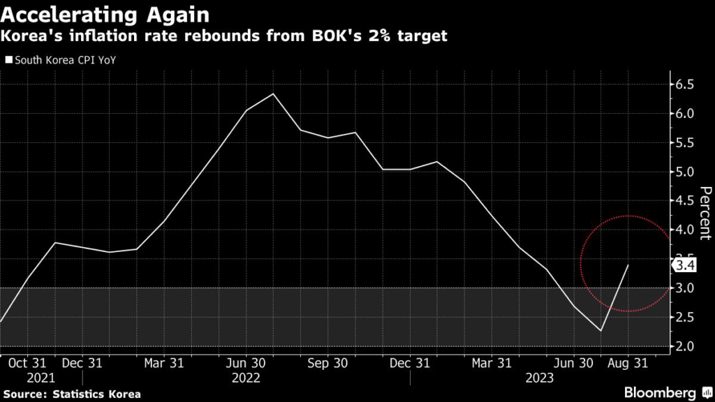 South Korea’s inflation outstripped forecasts in August partly on the back of higher energy costs, reinforcing the case for the central bank to keep the door open to further policy tightening to rein in prices.