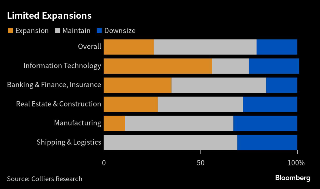 In banking, finance and insurance, about half plan to maintain their office space in the next two years, while tenants in the manufacturing and shipping sectors are most likely to downsize due to weakened global demand and heightened trade friction, Colliers International Group Inc.