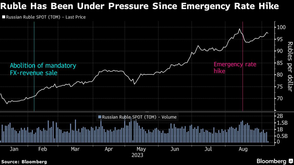 The ruble is among the worst performers in emerging markets in 2023 after losing about a quarter of its value against the dollar.