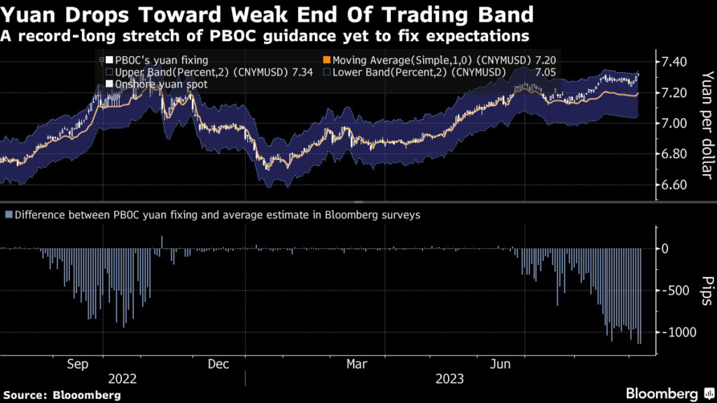 Weighed by China’s increasingly gloomy economic outlook and policy divergence with the US, the onshore yuan has slumped perilously close to the weak end of its 2% trading band.