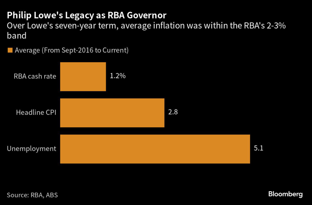 Australia’s underlying inflation averaged 2.7% over Lowe’s seven-year term that began in September 2016 — within the RBA’s 2-3% target band.