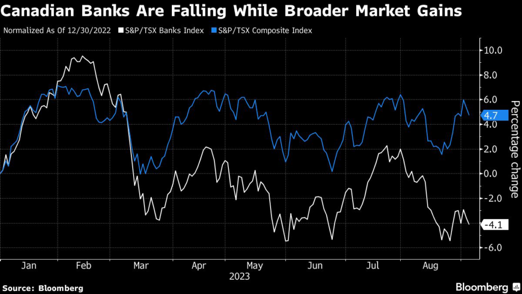 The banks, which make up the largest sector weighting on the S&P/TSX Composite Index, have dropped 4.6% this year, compared with the 4.3% advance in the broader market as concerns rise about a downturn in the country’s housing market and as quarterly results were largely a disappointment.