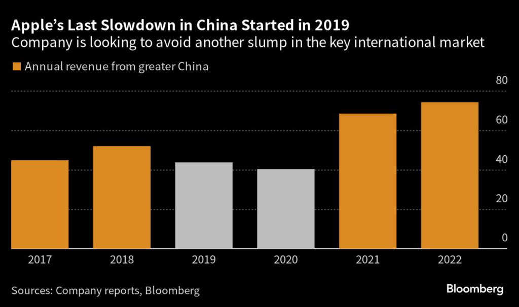 Apple’s Chinese revenue fell in fiscal 2019 and 2020, before rebounding in 2021. The company generates about a fifth of its sales from China, which is also the heart of Apple’s supply chain.