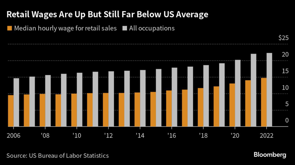 Retail wages are rising slightly faster than those in other industries, but retail employees still get paid a lot less than the median US worker. From 2006 to 2022, the median wage for retail salespeople rose 55% while US workers overall saw a 52% gain.