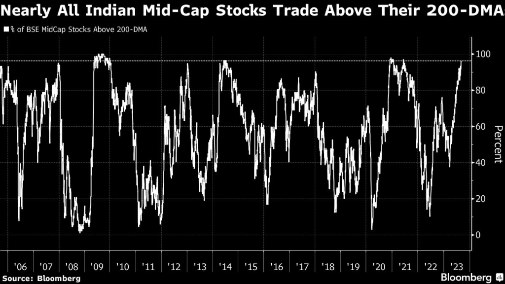 In a possible sign of overheating, 96% of stocks on the Indian mid-cap measure are trading above their 200-day moving averages, the most in over two years.