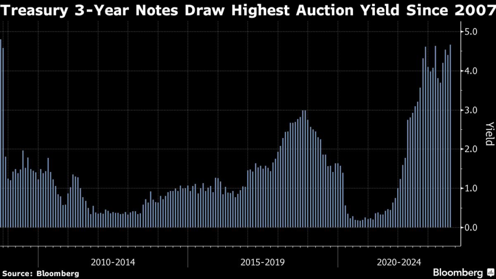 (Bloomberg) — The auction of three-year US Treasury notes on Monday drew the highest yield since 2007, reflecting the recent bond-market selloff driven by anticipation the Federal Reserve will keep rates elevated into next year.