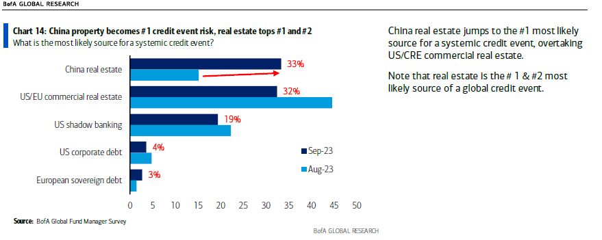 At the same time, 8% of those polled named a potential Chinese real estate “bust” as the biggest tail risk, following central banks kept hawkish by high inflation, worsened geopolitics, systemic credit event, a credit crunch, global recession and an artificial-intelligence-fueled bubble in tech.