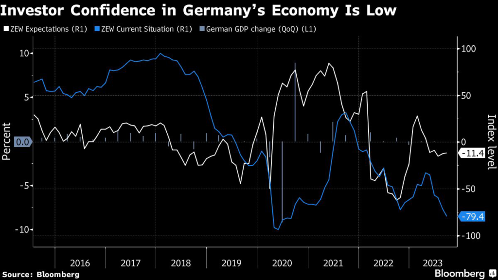 (Bloomberg) — Investor confidence in Germany’s economy improved for a second month, while lingering at a level that will do little to dispel intensifying concerns over the country’s status as Europe’s growth laggard.