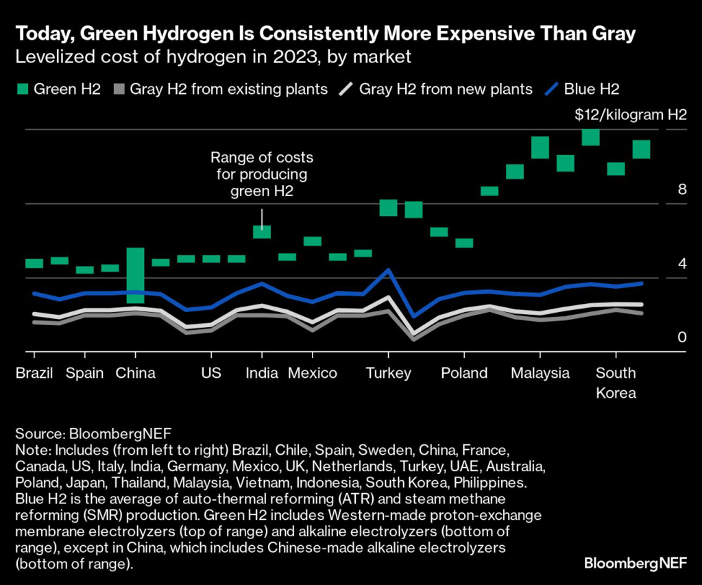 Adithya Bhashyam, an analyst at BNEF, says that when it’s available, “you can combine wind and solar and reach a higher utilization which makes the hydrogen cheaper. Grid electricity does not necessarily make hydrogen production economic because high utilization also means more exposure to higher power prices.