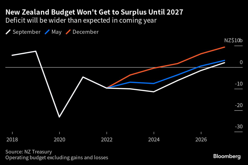(Bloomberg) — New Zealand will avoid a double-dip recession but faces larger budget deficits and a longer road back to surplus, according to the nation’s Treasury Department.