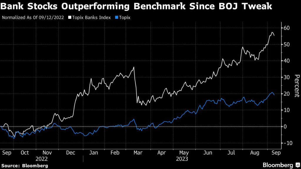 Banks have surged more than 50% over the past year on speculation gains in prices and wages will become sustainable enough for the BOJ to end years of rock bottom rates that have crushed their income.