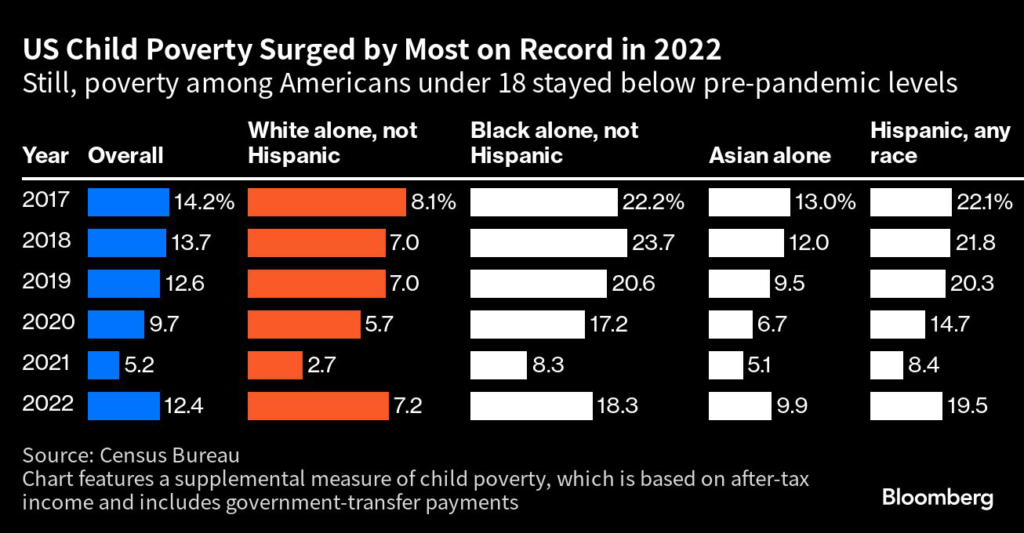 (Bloomberg) — US child poverty surged by the most on record last year following the expiration of unprecedented pandemic-era benefits.