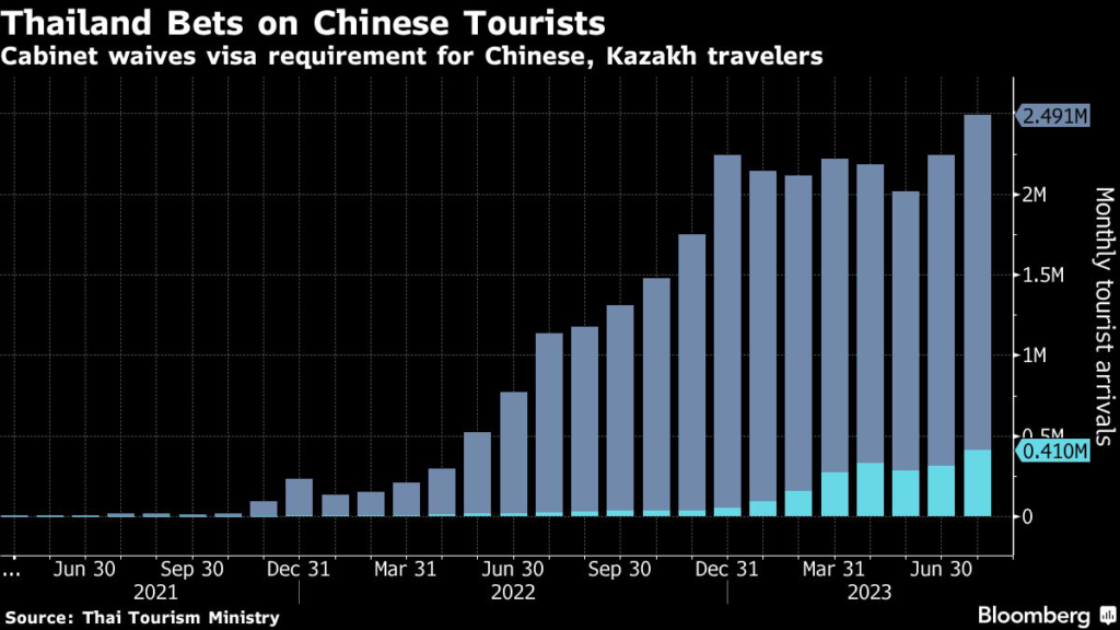(Bloomberg) — Thailand will waive visa requirements for travelers from China and Kazakhstan in the busy holiday season as the tourism-reliant nation turns to the travel industry to prop up Southeast Asia’s second-largest economy.