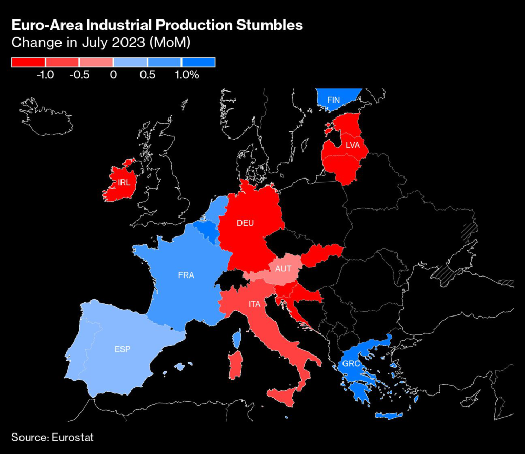 (Bloomberg) — The euro area began the second half of the year with a monthly slump in industrial production, adding to signs that manufacturing will keep weighing on economic growth.