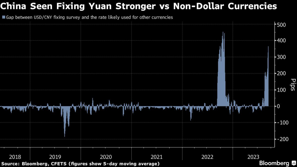The People’s Bank of China has been supporting the yuan versus 23 trading partners’ exchange rates — including the euro, yen and pound — with its daily fixings against these currencies since mid-August, according to calculations by Bloomberg.