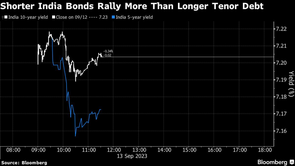 Yield on five-year bonds fell as much as 8 basis points to 7.16%, the most since May before paring slightly, while benchmark 10-year yields dropped 3 basis points to 7.2%.