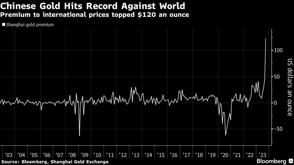 (Bloomberg) — Gold in China is trading at a record premium to international prices, a sign of Beijing’s escalating battle to defend its currency.