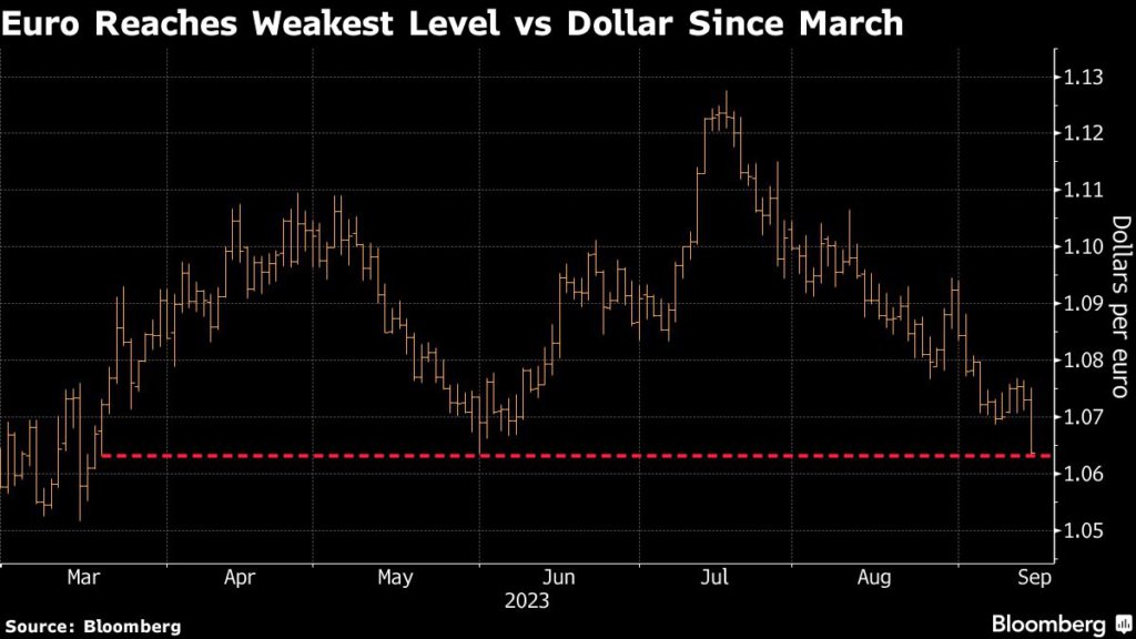 (Bloomberg) — The euro fell to the lowest level in more than five months against the dollar Thursday, extending a slide unleashed by the European Central Bank’s latest interest-rate increase, which traders are concluding was likely its last.