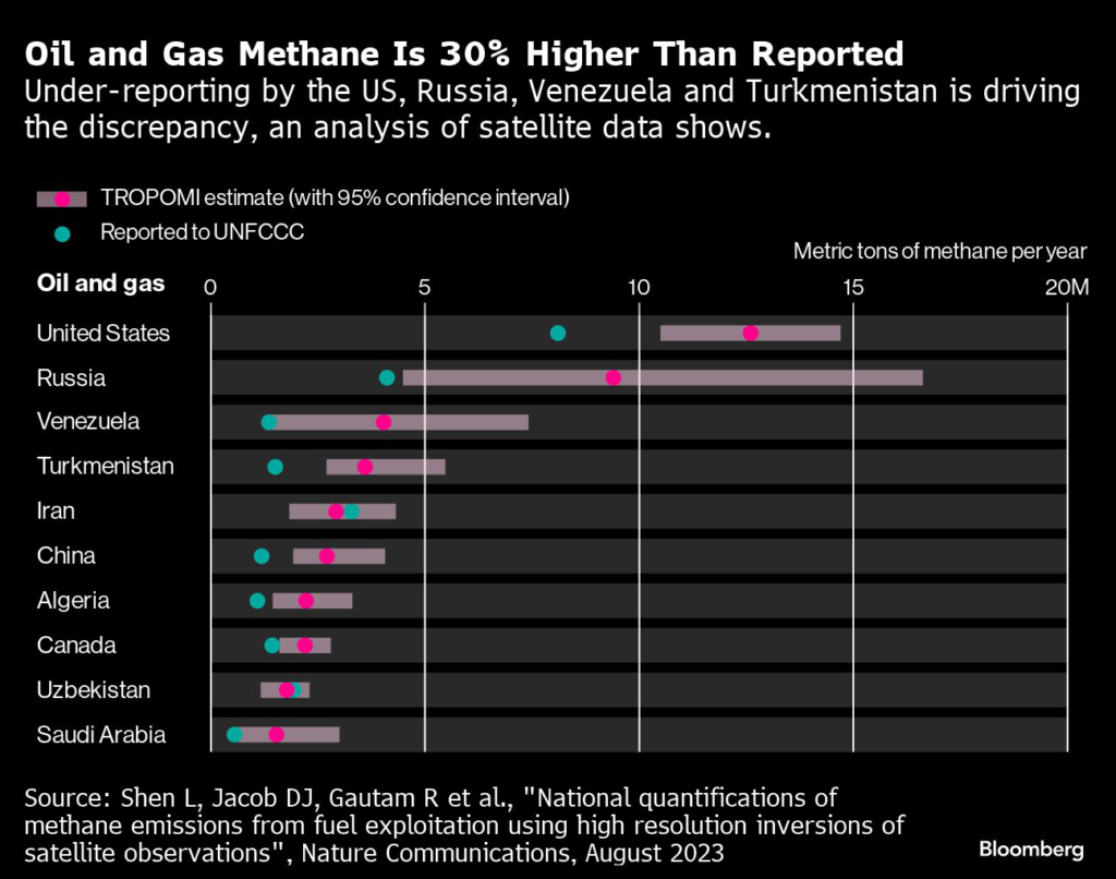 (Bloomberg) — Observed methane releases from global oil and gas operations are 30% higher than what countries estimate in reports to the UN, according to a new study that analyzed satellite observations of the potent greenhouse gas.