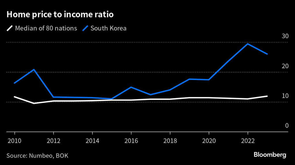 South Korea’s house price-to-income ratio, or PIR, is 26, according to cost-of-living data website Numbeo.