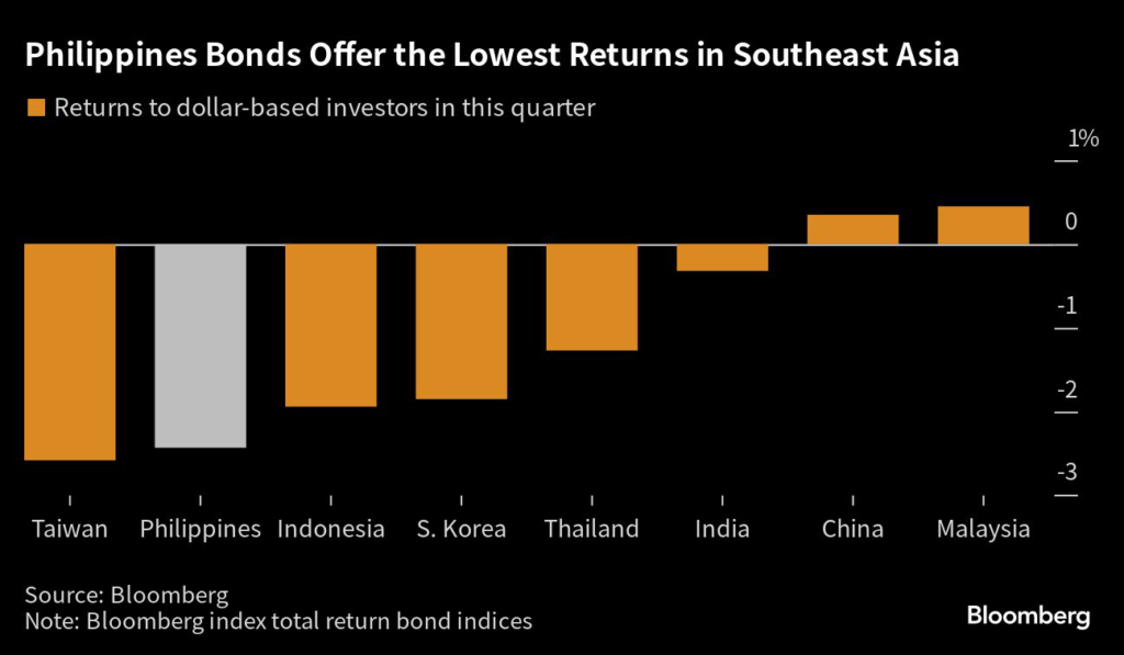 A Bloomberg index of Philippine bonds handed dollar-based investors a loss of 2.3% this quarter, the worst returns in Southeast Asia.