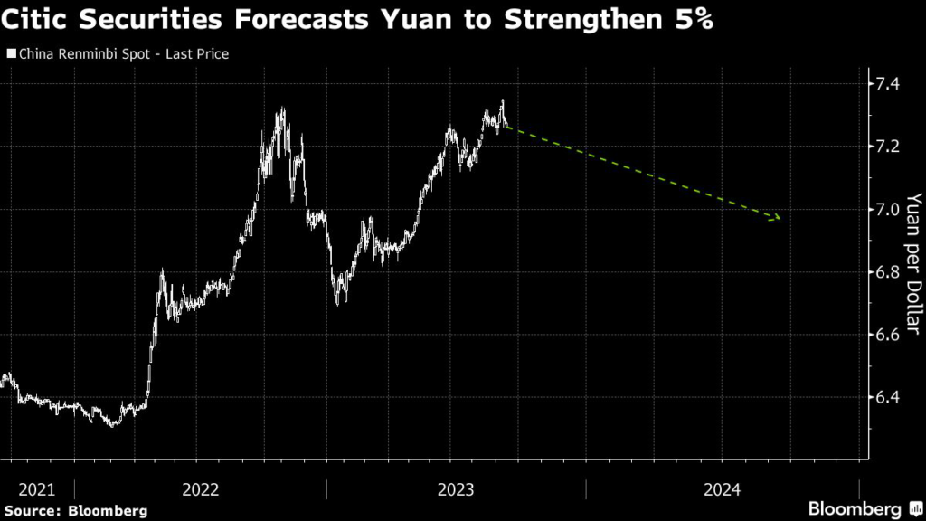 (Bloomberg) — The yuan is set to bounce as the government’s efforts to boost consumption bear fruit and the lure of higher-yielding assets abroad diminishes, according to the offshore wealth arm of Citic Securities Co.