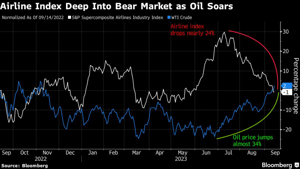 At the same time, analysts’ average 2023 profit estimate for US airlines has fallen 8% since the beginning of July, according to Bloomberg Intelligence data. Expectations for 2024 earnings have dropped 10% in that same period.