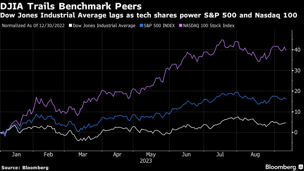 As such their bouts of underperformance versus other indexes are of no theoretical consequence to overseers. Still, it’s hard to miss the degree to which the 127-year-old average has trailed in 2023 due to both the composition and weighting of its technology holdings, which include relative market duds like IBM Corp.
